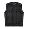 The 49/51 is our standard club vest, crafted from Heavy Hitter Canvas and Diamond Cowhide. This version has a rolled collar, covered snaps and hidden zipper. The 49/51 is unlined, and perfect for warm weather! It has our standard conceal carry pockets, along with two summaryed snap pockets and two summaryed chest pockets.