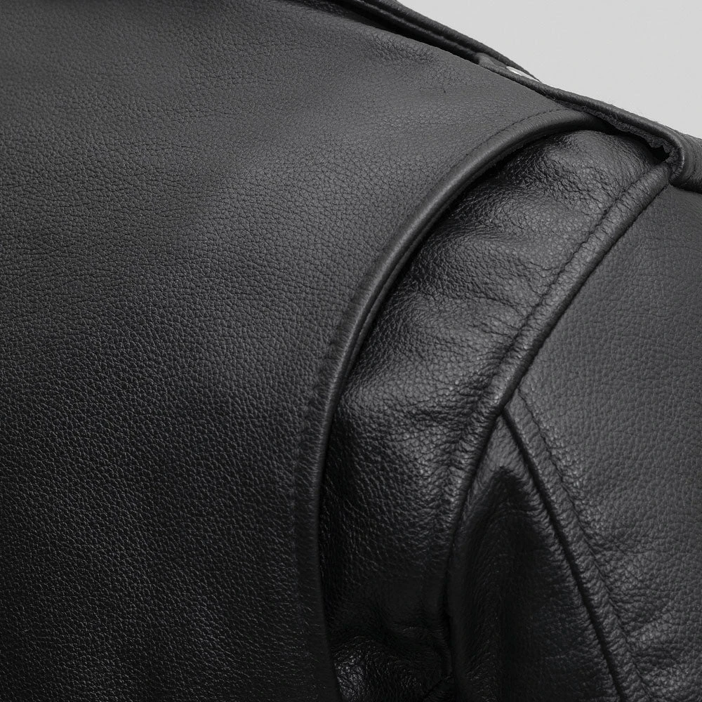 - Motorcycle style with snap down lapel, collar, epaulets and asymmetrical zipper