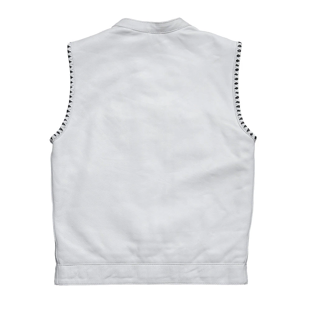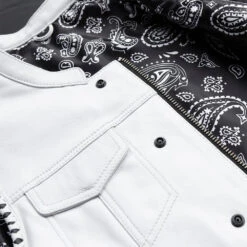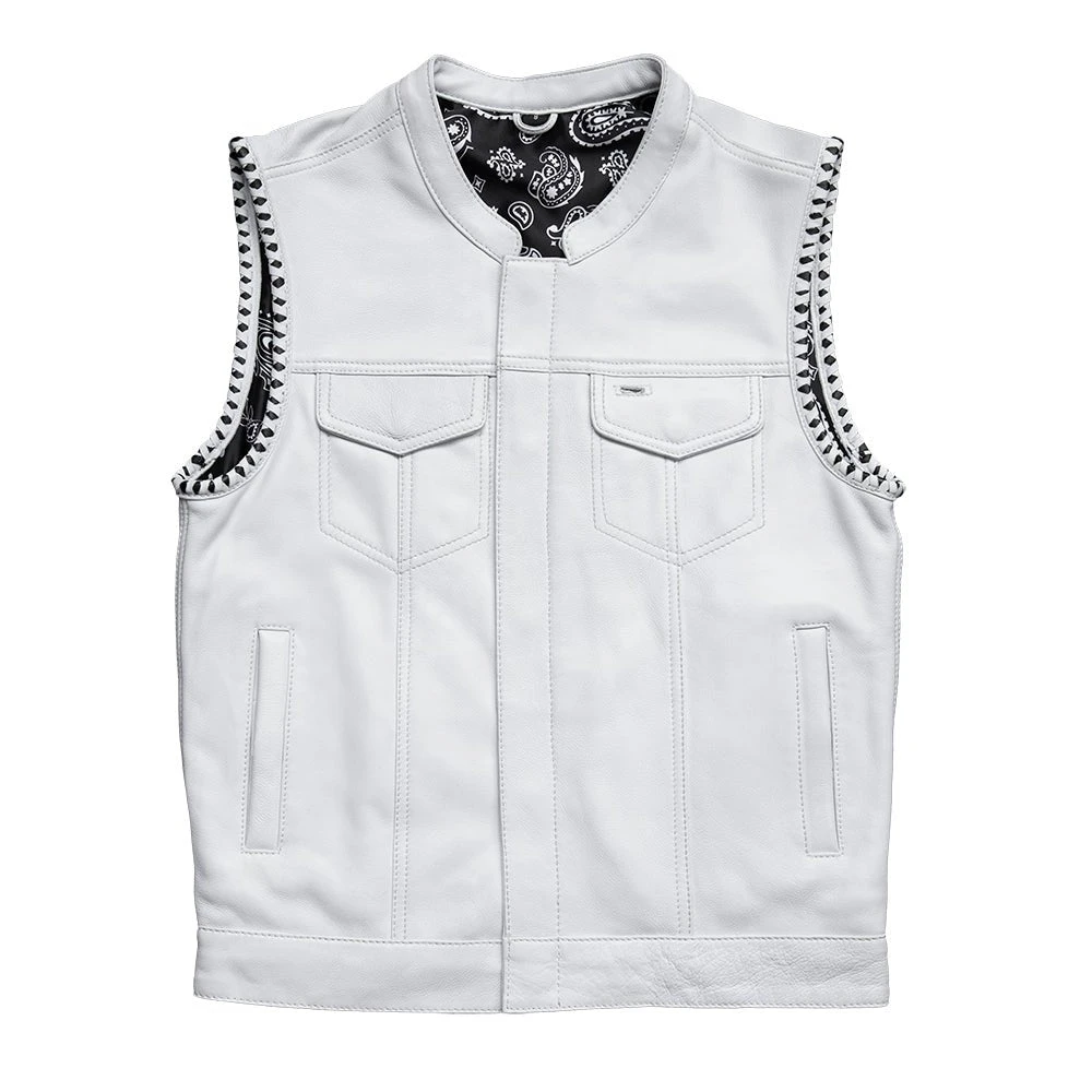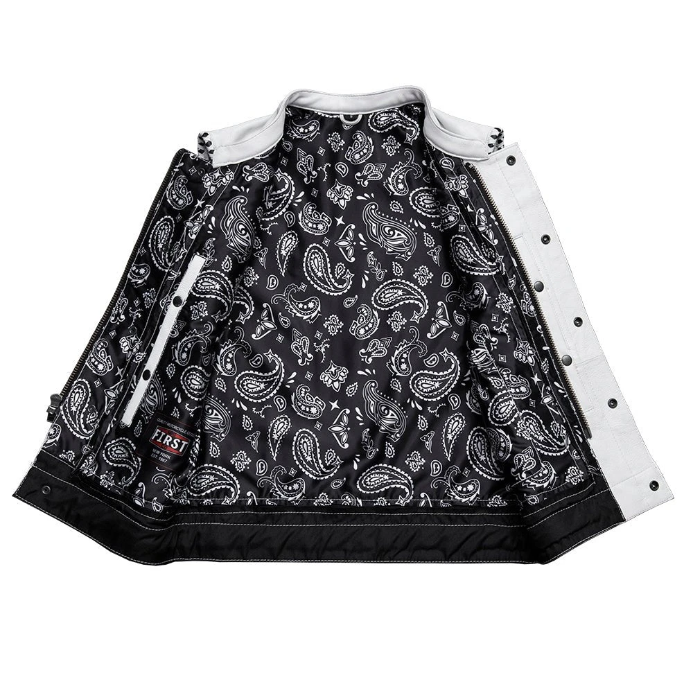 This club-style leather vest is a limited edition Factory Custom! With white leather and black accents, and a black and white paisley liner, this one is unique and is sure to stand out from the crowd!