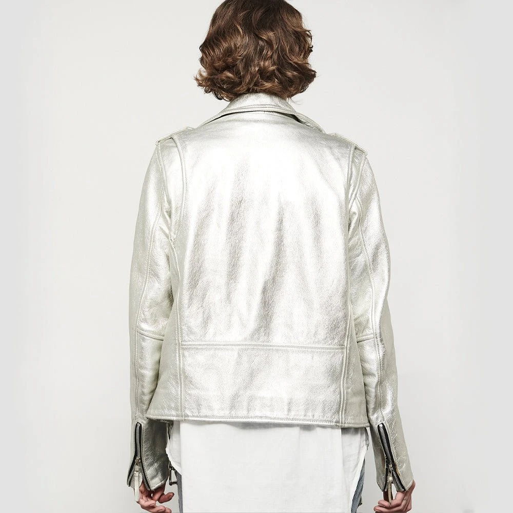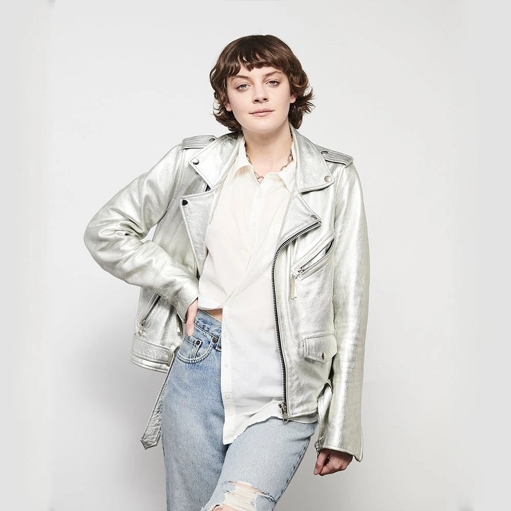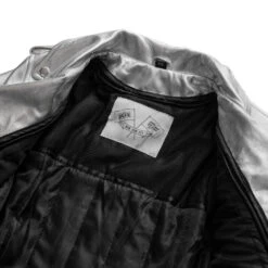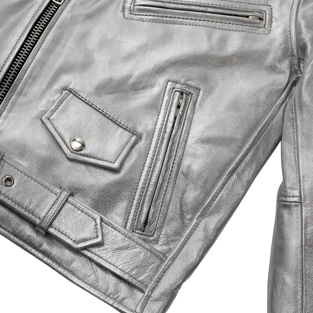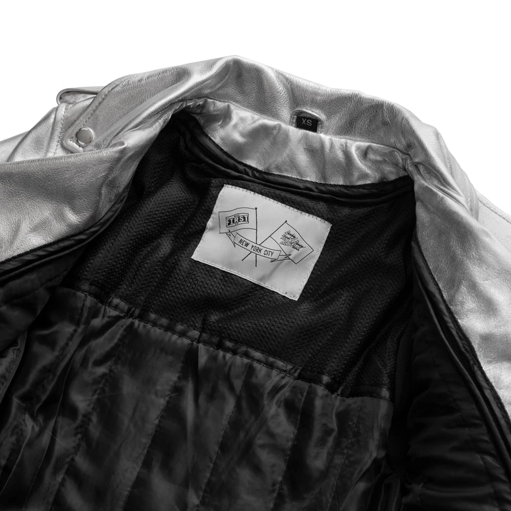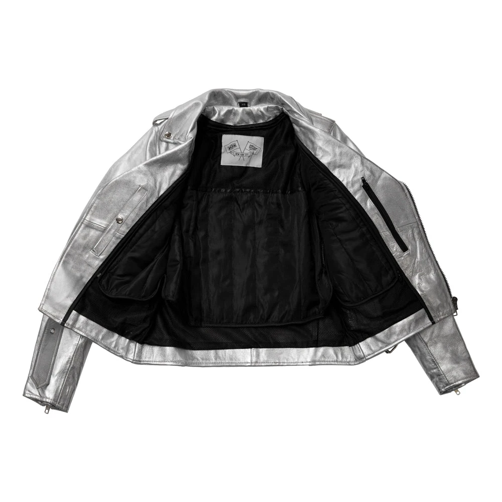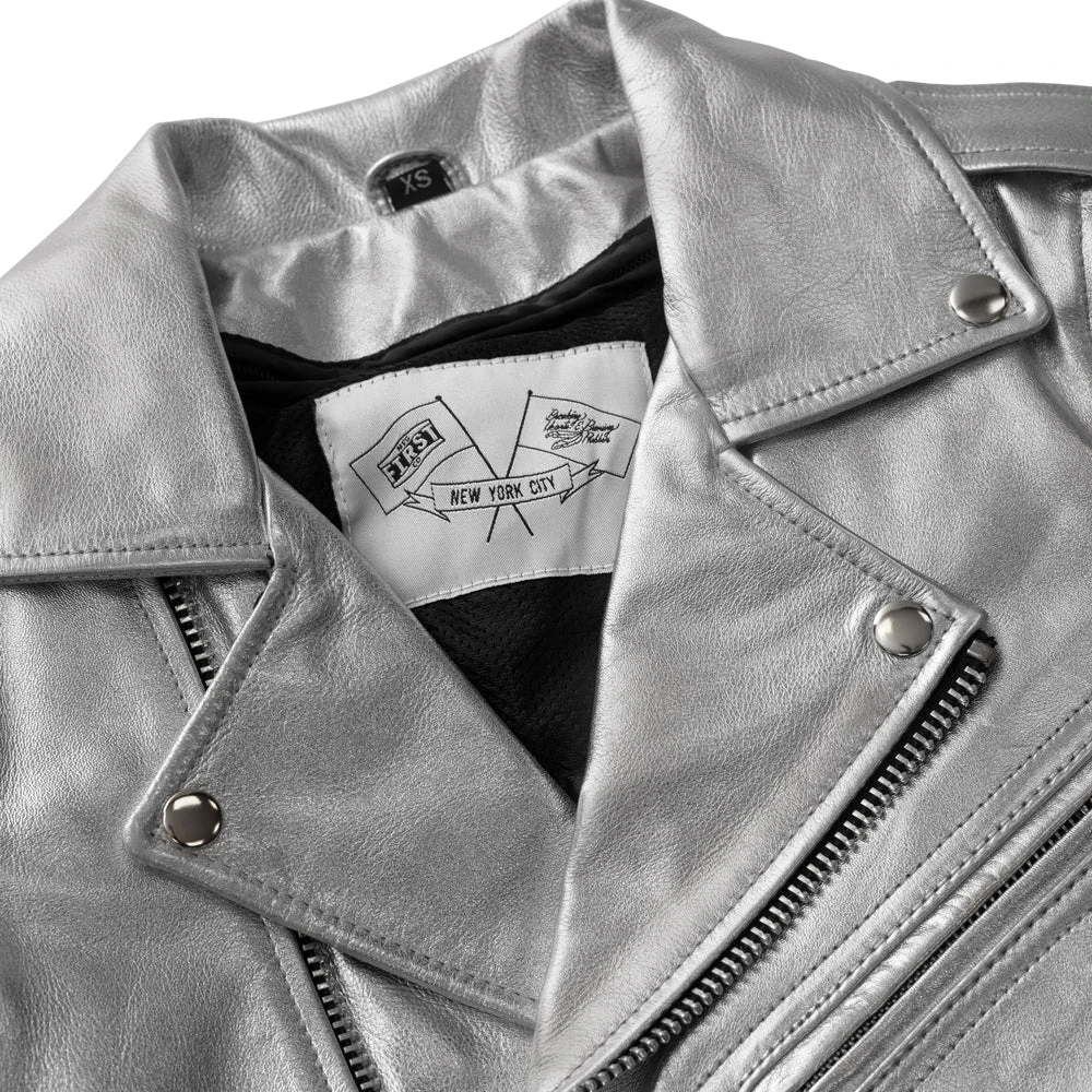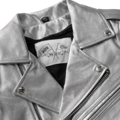 This vivid silver leather jacket is going to set you apart from everyone. The bold metallic leather is an up to date version of our Karla jacket to get you noticed no matter if you are on or off a bike. We sold out of our first production and because of such a high demand we brought it back. Designed with a motorcyclist in mind this jacket has a flattering fit though body and is tapered to the waist. This jacket is considered an all-season riding jacket. And yes, even though it’s silver, it’s leather!