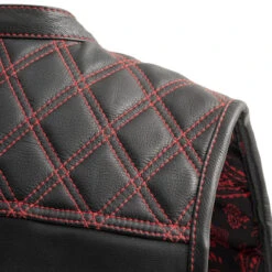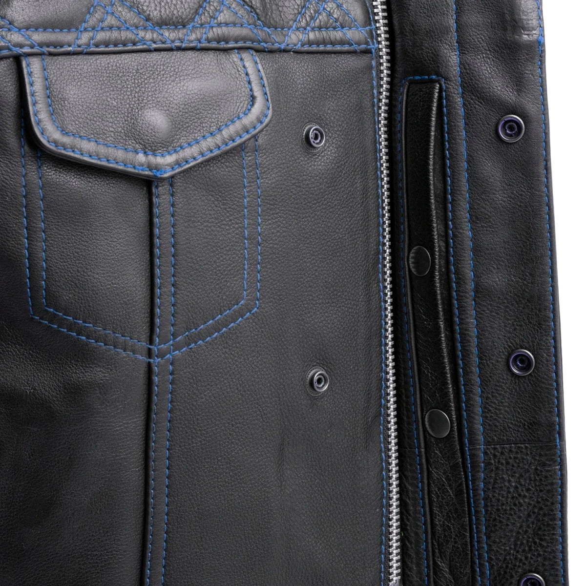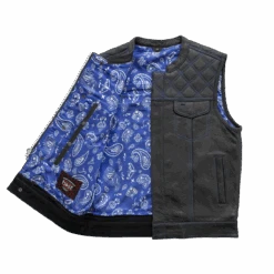 The Downside is an all leather club style vest, that fits just like our Sharpshooter and other standard club vests. It’s got a one-inch collar, and cropped center zipper for comfort while sitting on the bike. A mesh lining keeps you comfortable, and also has an easy access zip so you can easily add patches or embroideries. And of course, it’s got our conceal carry pockets!