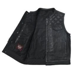 The Downside is an all leather club style vest, that fits just like our Sharpshooter and other standard club vests. It’s got a one-inch collar, and cropped center zipper for comfort while sitting on the bike. The mesh lining keeps you comfortable and of course, it’s got our conceal carry pockets!Â