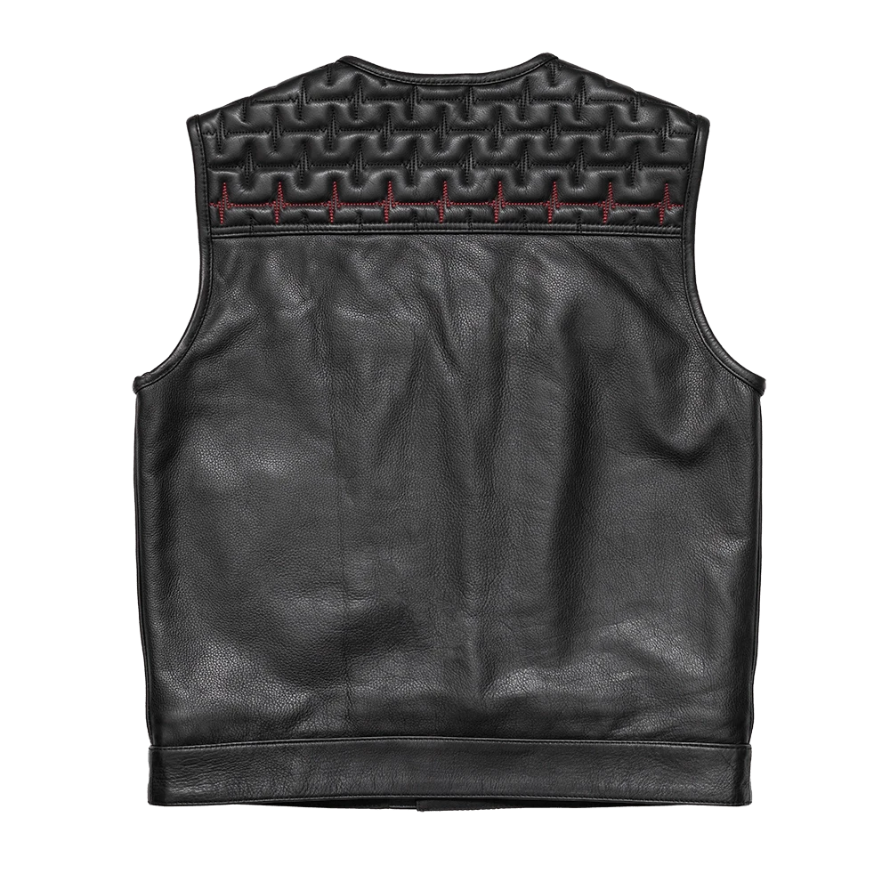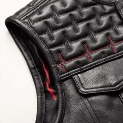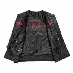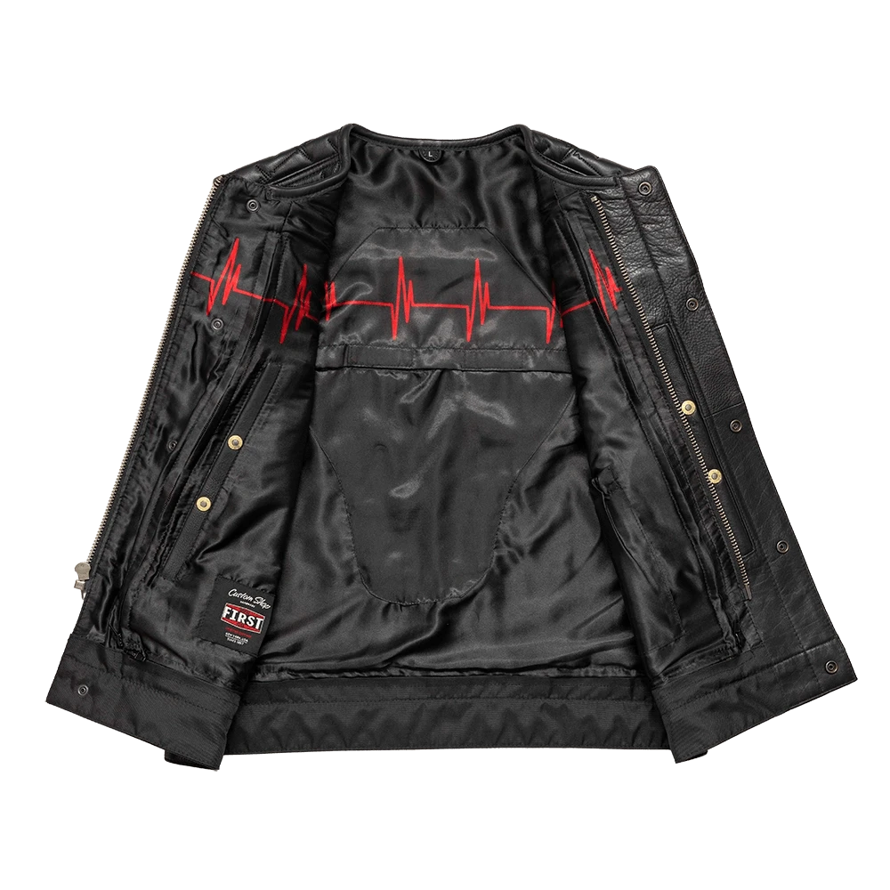 The EKG Men’s Leather Motorcycle Vest (Limited Edition) club style vest. This vest features a rolled collar, covered snaps, cropped center zipper, with a single red EKG stitch across the chest with a custom liner to match.