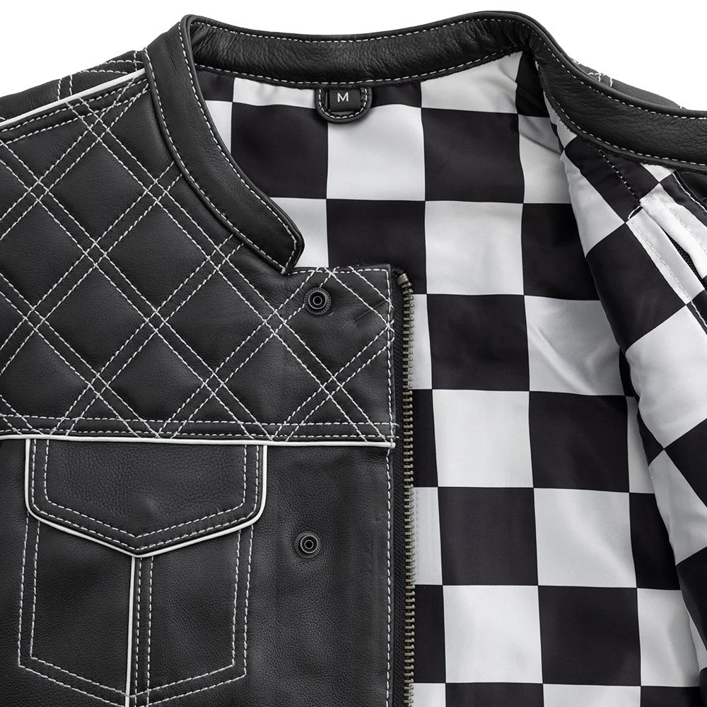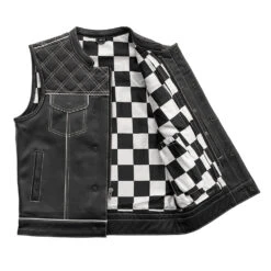 Our Finish Line Collection is a high-horsepower collection of vests! Available in a variety of colors, these checkered flag vests are ready to race. Crafted from Diamond Naked Cowhide, these club style vests rock a one inch collar, colored piping, covered snaps, and a cropped center zipper for comfort while riding. The three panel liner is a satin checkerboard fabric, that zips part way out for easy access to add patches. Lots of pockets, including two conceal carry pockets for everything you need to bring.