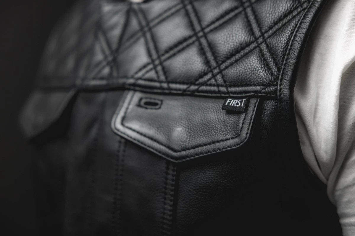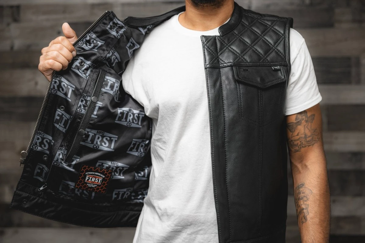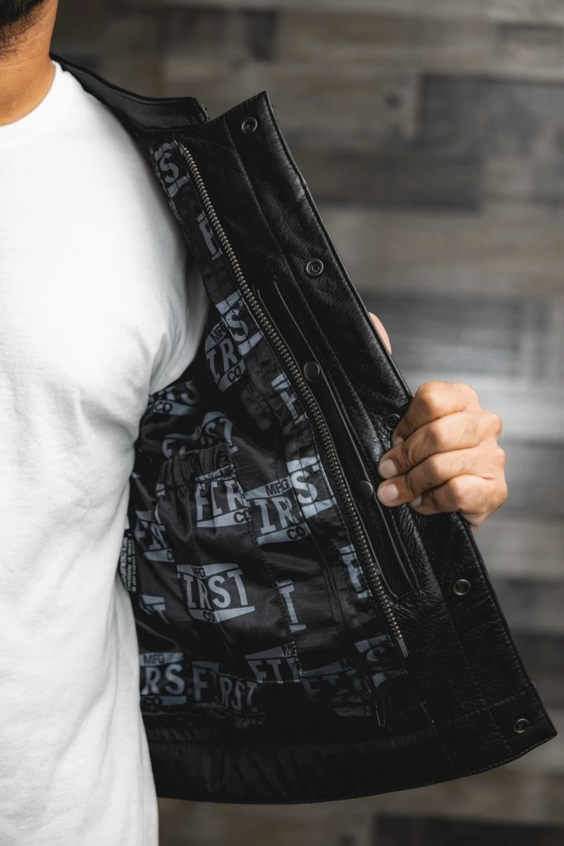 Here it is – our SIGNATURE vest! We took fan favorite features from many of our vests to create our favorite! This is a club style vest, with a one inch collar, a cropped center zipper for comfort, that’s hidden by covered snaps. The shoulders feature our black double diamond stitching. Plenty of pockets, including two conceal carry pockets. The satin liner with FMCo logos is easy access – so you can just unzip to add patches or embroideries. And always, it’s got our Lifetime Warranty!