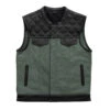 The Gun Slinger is a western style vest with a V-neck and four snap front, featuring Buffalo Nickel snaps. It’s got two slash pockets up front, and two conceal carry pockets. The sides are laced, so you can easily adjust the sizing to fit, even when seated on the motorcycle. Mesh lining will help keep you cool, even in warm weather.