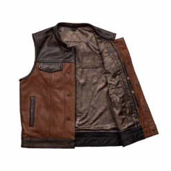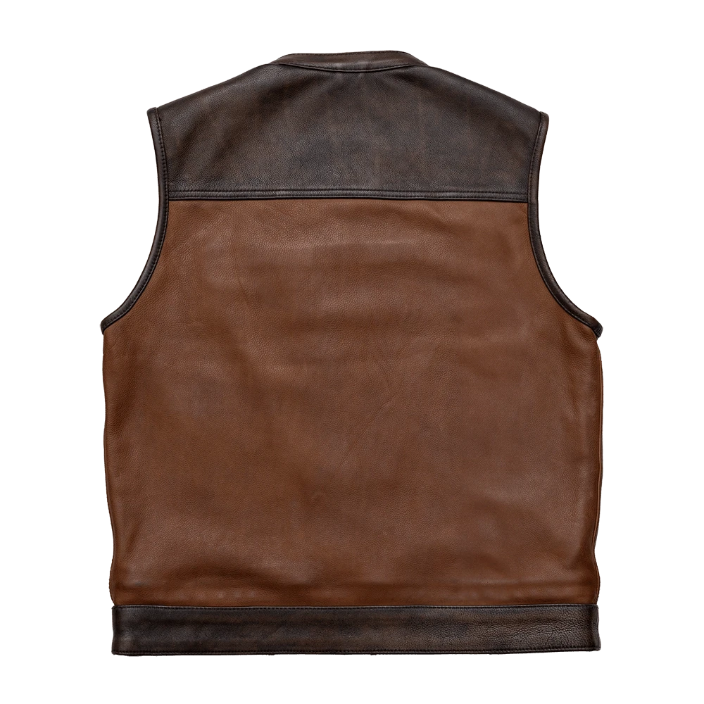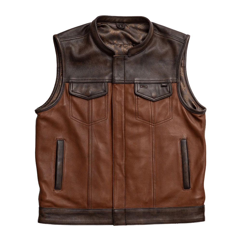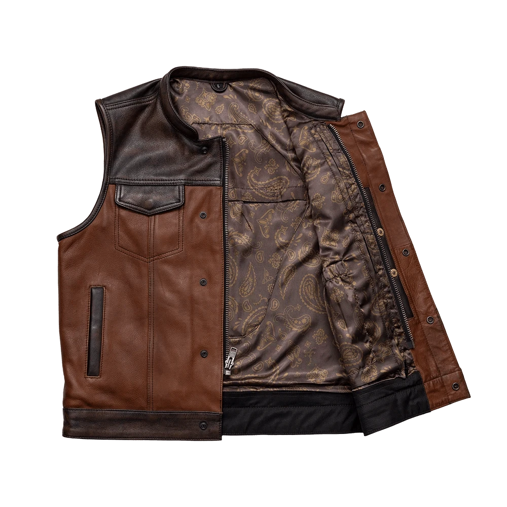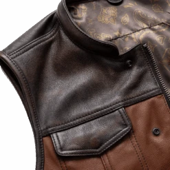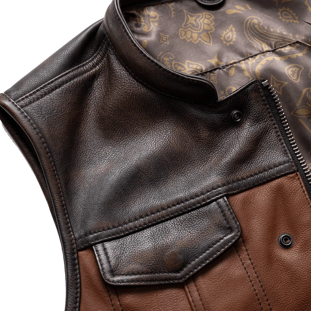 The Gunner features our Vintage Brown upper panel and belt, with our signature whisky brown on the torso. The vest includes a classic banded collar, covered snaps, cropped center zipper. We added a custom Brown and Gold bandanna liner, with easy access panels for adding patches and embroideries.