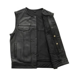 The Highside is a collarless club style vest crafted from Platinum Naked Cowhide, with covered snaps and a cropped center zipper. Four pockets up front with snaps, and two conceal carry pockets for everything you need to carry. The mesh lining has easy access panels for patches, and a single back panel so there’s no seams you’ll need to sew over. It also has blacked out YKK zippers and hardware for a seamless look.
