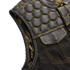 The Hornet is a unique version of our standard club vest – featuring the beehive style stitching on the shoulders. This vest has a roll up collar, covered snaps, and cropped center zipper along with all of our FMCo pockets.
