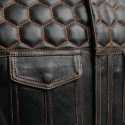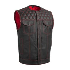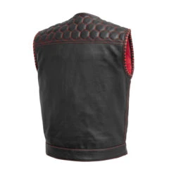 The Perforated Hornet is a unique version of our standard club vest – featuring the beehive style stitching on the shoulders. This vest has a rolled collar, covered snaps, and cropped center zipper along with all of our FMCo pockets.