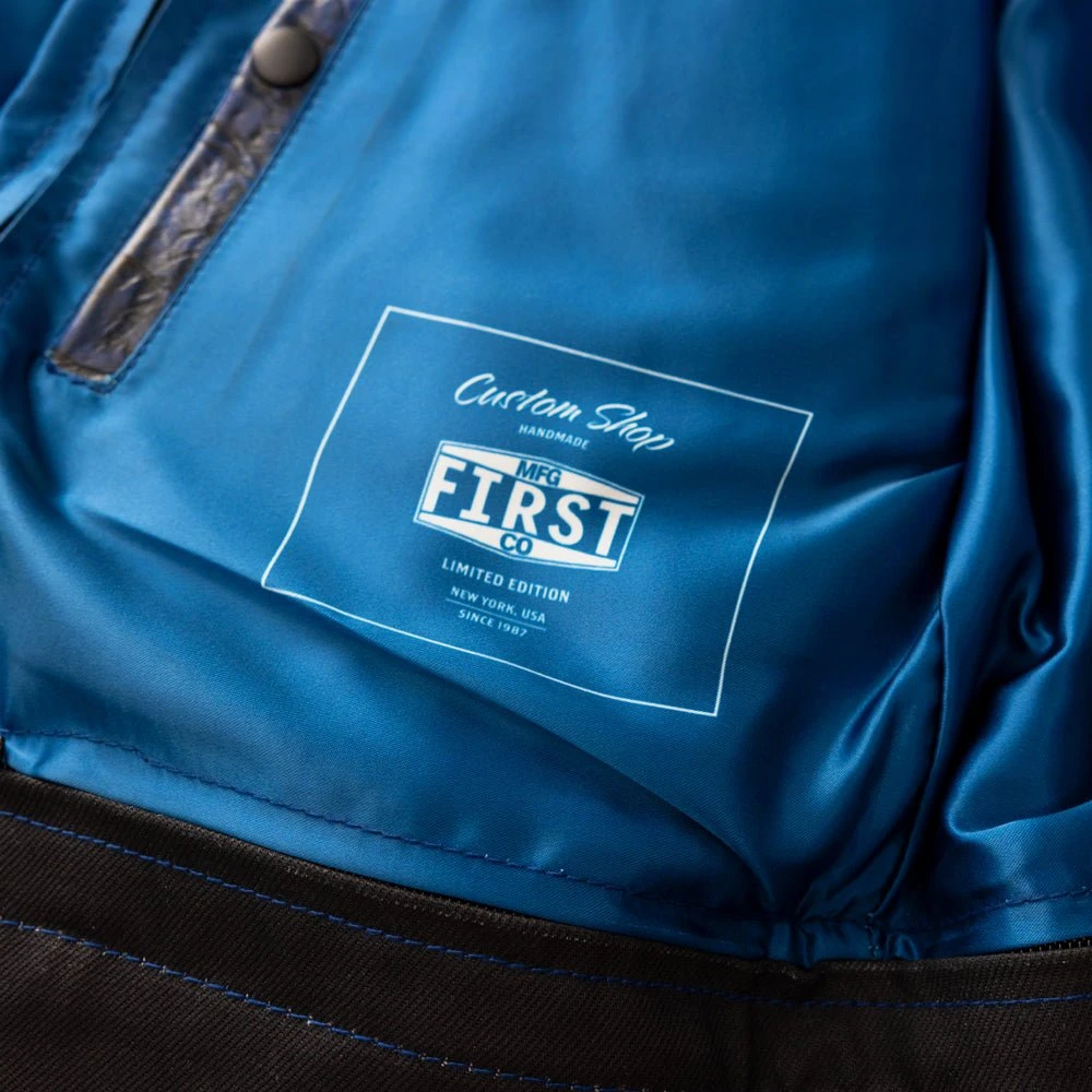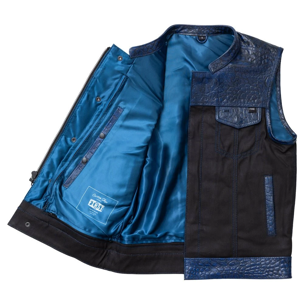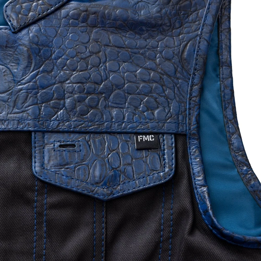 Crocodile! The Horntail features blue crocodile embossed leather on the shoulders and accents, with a jet black denim torso. This club style vest has a one inch collar, covered snaps, and cropped center zipper. And of course, plenty of pockets!