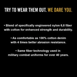 - Outer Shell – 75% Cotton, 13% Polyester 10% Cordura® Nylon and 2% Spandex