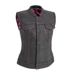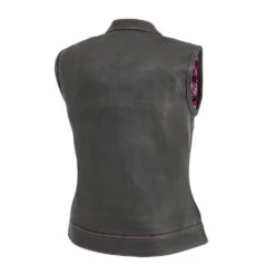 This isn’t your normal club style vest – the Jessica vest has bright pink stitching throughout and features a white and pink paisley, three panel liner that easily zips out to gain access to the back to add patches or embroidery. It’s crafted from Diamond Naked Cowhide in a club style with one-inch collar, covered snaps and a hidden, cropped center zipper for more comfort while seated on your motorcycle.