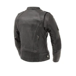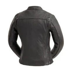 The Katana is a women’s version of a SWAT style vest crafted from .8 – .9mm Diamond Cowhide. This style takes cues from tactical vests, with three Velcro hook and loop straps on each side. Up front, the padded details add to the tactical style. Two zippered slash pockets give you plenty of storage. The full length zipper is hidden, and it features no collar, which is great for layering. The back is a single panel with a dropped back for a little extra coverage when seated on your motorcycle. The mesh interior will help keep you cool, and has easy access panels for easily adding patches or embroideries. The liner also has a pocket for back armor, to help keep you protected!