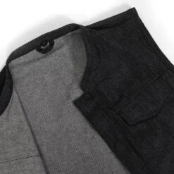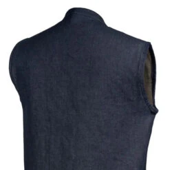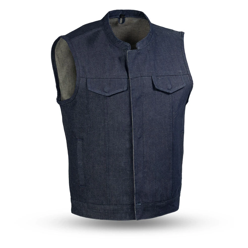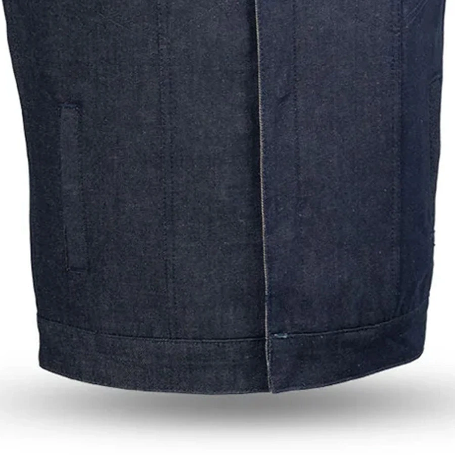 The Kershaw is a club style vest in our Rough Neck Raw Denim. It’s a club style vest with one inch banded collar and covered snaps. A cropped center zipper helps ensure the vest won’t ride up while you’re riding. Two conceal carry pockets, two chest pockets and two slash pockets for everything you need to carry. This one is unlined, and great for warmer weather or layering.