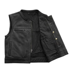 - Club style vest with one-inch collar, covered snaps and hidden cropped center zipper