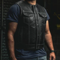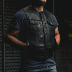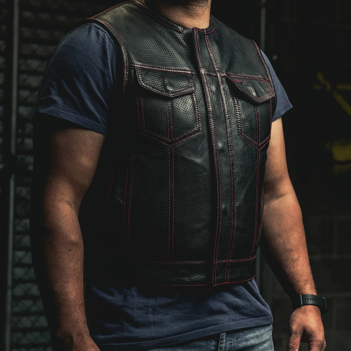 Our best selling club vest is now built for summer. Stay cool and protected with perforated Diamond Naked Cowhide leather. The Lowside runs 3 inches shorter than a standard vest, so it won’t stack up around your waist or lift at the shoulders while you’re riding. It also runs a half size smaller in the chest than other vests like the No Rival or Highside. The Lowside vest features our standard conceal carry pockets, mesh lining, mesh conceal pockets for air flow, single back panel, and a rolled collar.