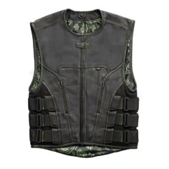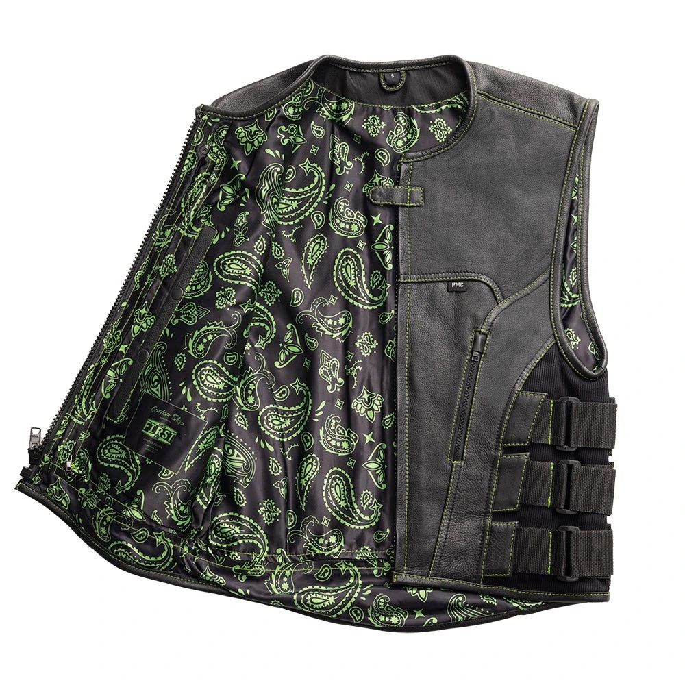 The Ninja is a swat style vest featuring three nylon side straps that are adjustable for proper fitment. This limited edition vest has green stitching, along with a black and green paisley liner. It’s got our two conceal carry pockets, and easy access panels for easily adding patches or embroideries.