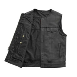 The No Rival is a club style vest with a rolled collar, single panel back, and mesh lining with easy access panels to easily add patches or embroideries. This vest is crafted from Naked Cowhide, and features a single panel back on sizes up to 5X.Â