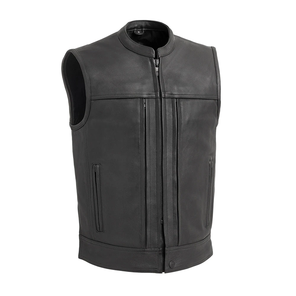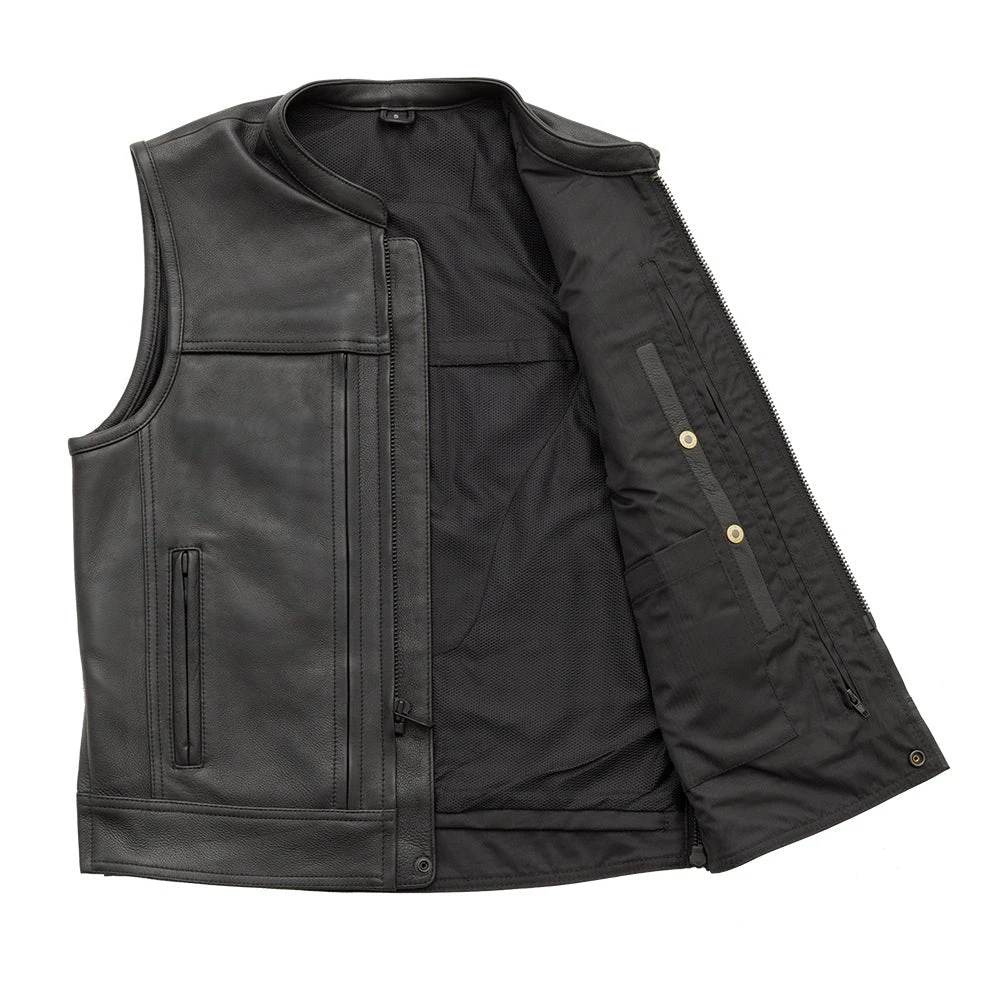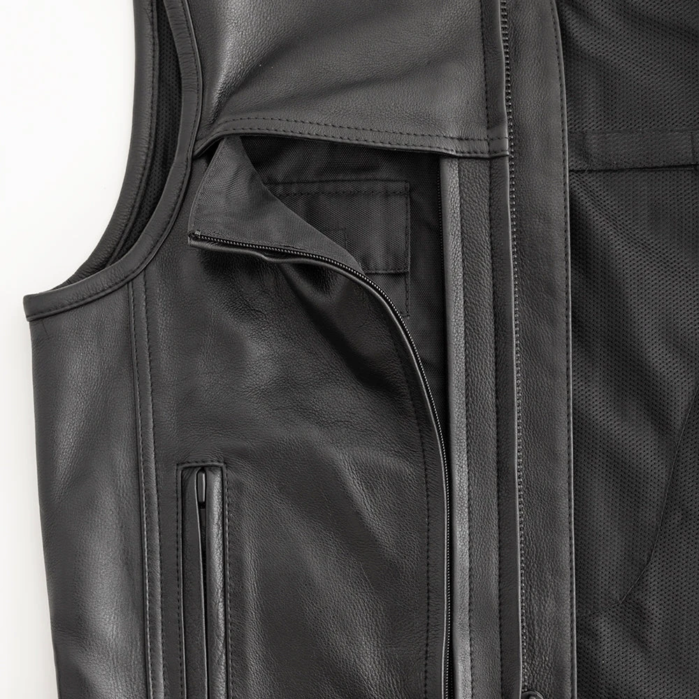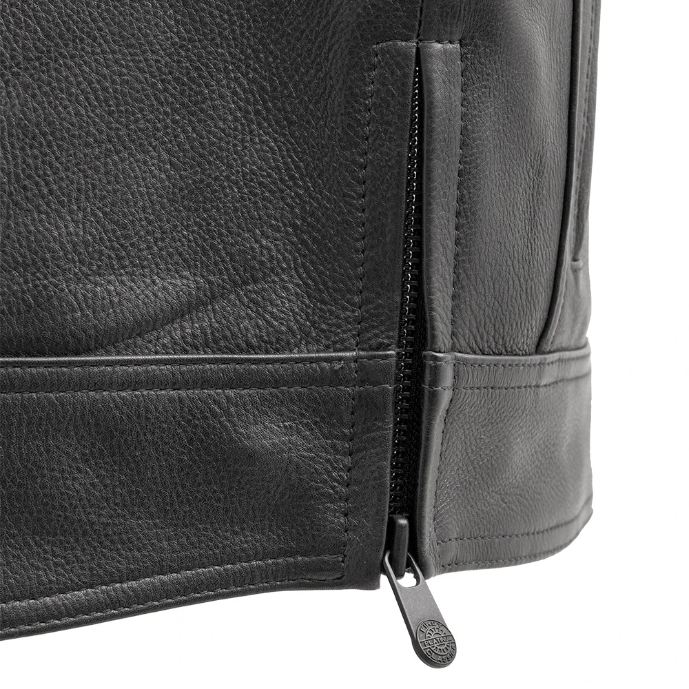POCKETS! If you need extra pockets, the Rampage is for you. Crafted from Platinum Naked Cowhide, this club style vest has EIGHT hidden utility pockets under a zipper on the front of the vest. Plus, two conceal carry pockets, and an interior cellphone pocket. Side relief zippers allow for easy adjustments to be comfortable when seated on the bike. Oh, and all of the hardware is blacked out for a clean look.