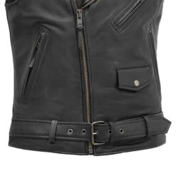 - Moto style vest with snap down lapel collar and asymmetrical zipper