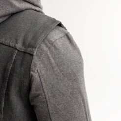 The Rook is a Rough Neck Raw Denim vest with a shirt collar. It has our conceal carry pockets, and a cropped center zipper. The Rook and hoodie are designed to be worn together as a seamless set or separately as stand-alone pieces. It has three summarys, loop attachment points; one at the back of the neck and one at either side of the waist, assure that the combination stays in place when worn together.