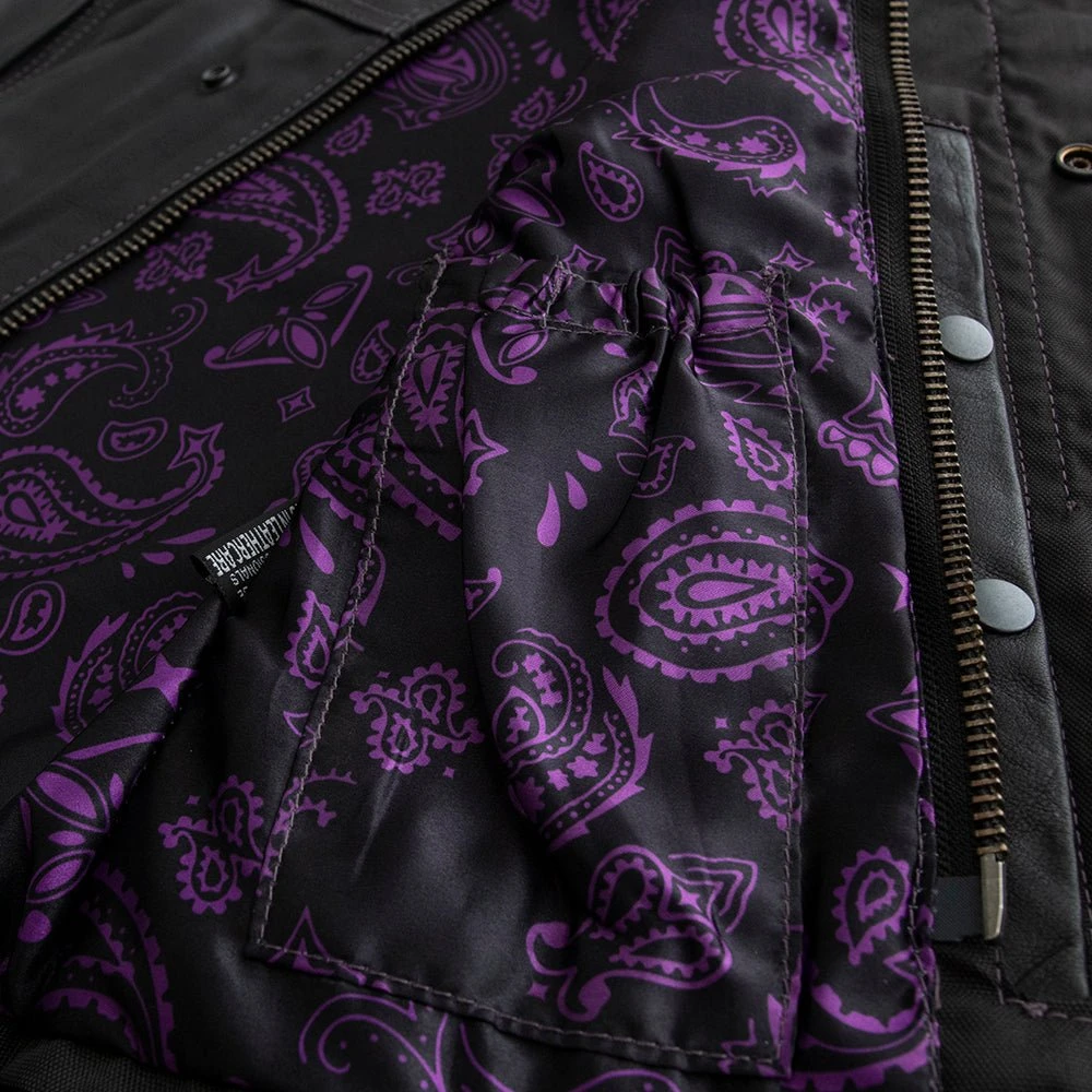 We could be royals… in this vest! This club style cowhide leather vest has purple stitching throughout. It has all of our favorite First MFG features like pockets, the cropped center zipper, and more!