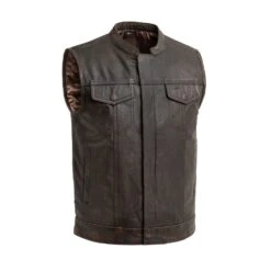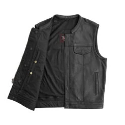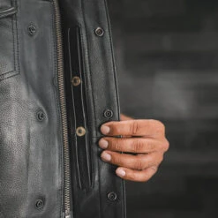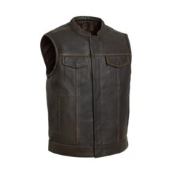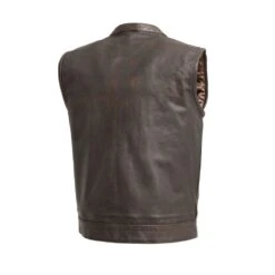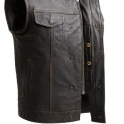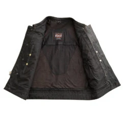 Looking for a clean, classic club style vest? The Sharp Shooter has a banded collar, covered snaps and covered, cropped center zipper. Four pockets up front, and a single panel back with two conceal carry pockets. It’s got a mesh lining, with easy access panels for adding patches and embroideries.