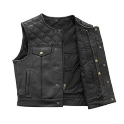 The Shell Shock Vest was born from an idea that one of our customers requested. The vest includes a classic rolled collar, exposed shell snaps, cropped center zipper. The double diamond tonal stitching adds a level of class to this item that is sure to turn heads at your local bike night. The all black interior stays true to the aesthetics. You will find easy access panels for adding patches and embroideries. Note – This vest is built on our Upside Vest pattern and is 2 inch shorter than our standard club vest. This pattern makes the vest sit better in the riding position.