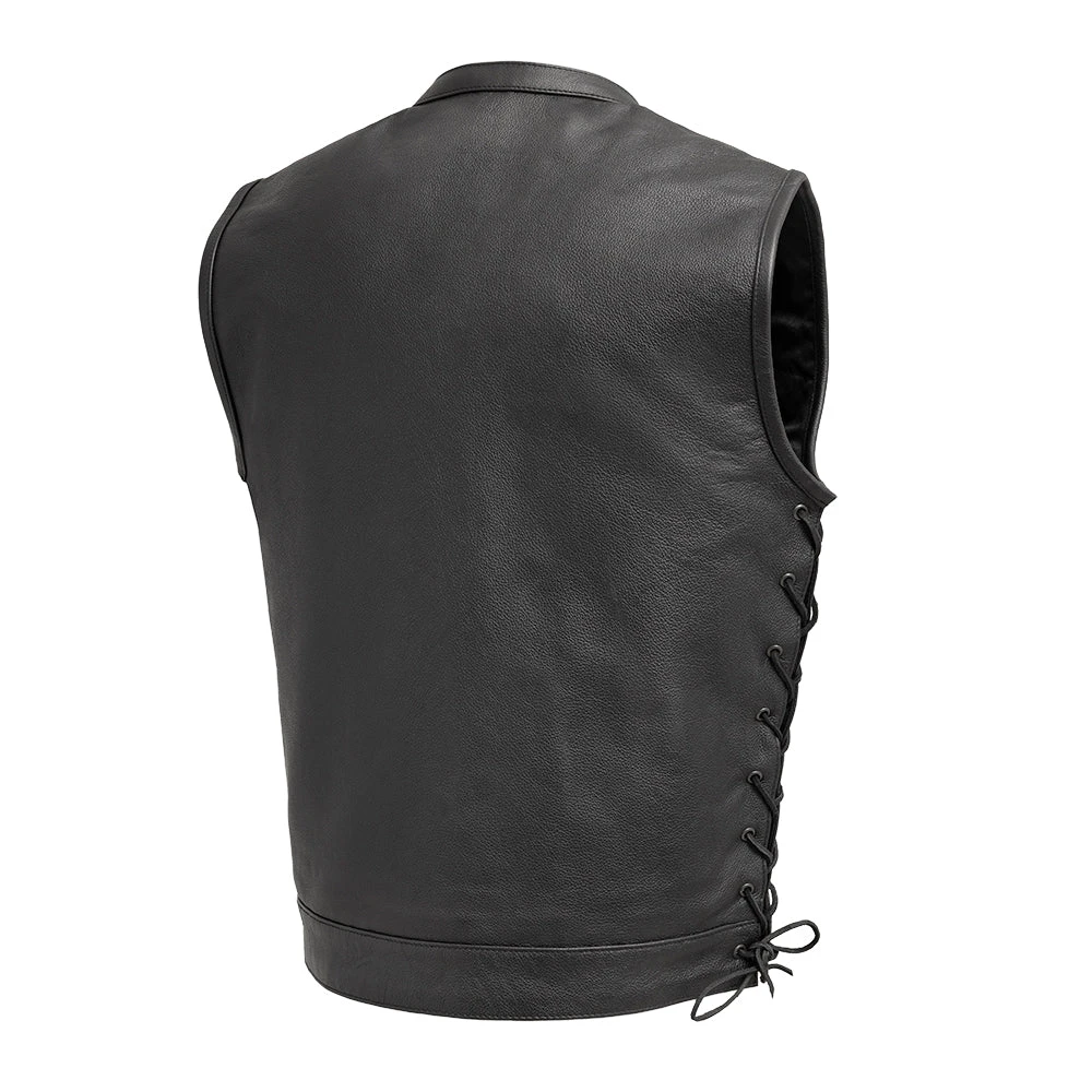 The Sniper is a club style vest crafted from Naked Cowhide. This vest features side lacing for easy size adjustment, a cropped center zipper for comfort, and mesh lining with easy access panels for easy patching. It has our standard conceal carry pockets, too!