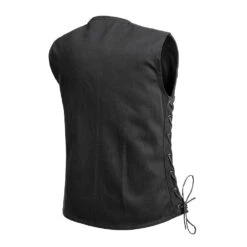 The Tiff is a women’s lightweight vest with V-neck made in our lightweight black twill. This vest is perfect for warm days on the motorcycle. The side lacing provides an easy way to layer, or just get a little extra breathing room. The single panel back makes for an easy spot to add patches or embroideries. And it’s available up to a size 5x!