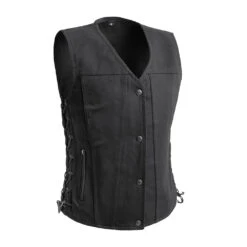 The Tiff is a women’s lightweight vest with V-neck made in our lightweight black twill. This vest is perfect for warm days on the motorcycle. The side lacing provides an easy way to layer, or just get a little extra breathing room. The single panel back makes for an easy spot to add patches or embroideries. And it’s available up to a size 5x!