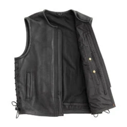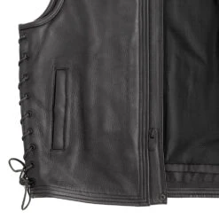 The Venom vest features a single, blacked out, visible center zipper up front with two slash pockets. It’s got side lacing, making it easy to adjust the fit when seated on your motorcycle. It has mesh lining with easy access panels to add patches to the single back panel. It’s crafted from Platinum Naked Cowhide, so it’s heavy duty enough to give you great protection out on the road.
